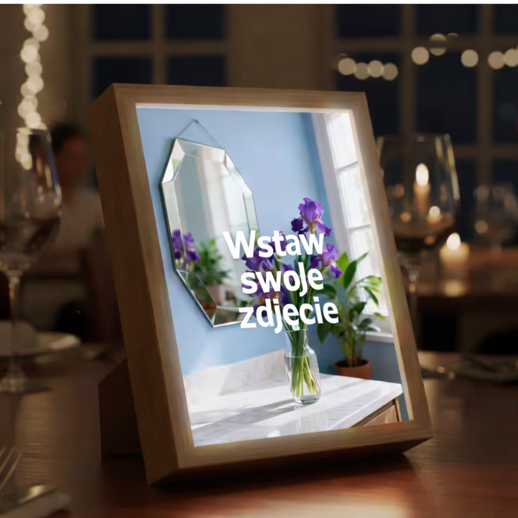 Elegancka, drewniana ramka wyglądająca jak lustro na zdjęcie z subtelnym podświetleniem ✨, która pięknie eksponuje najważniejsze wspomnienia! Jej minimalistyczny design sprawia, że idealnie pasuje do każdego wnętrza – od nowoczesnych po klasyczne 🏡. Delikatne światło tworzy ciepłą, romantyczną atmosferę, idealną na wieczory we dwoje 🕯️💑.